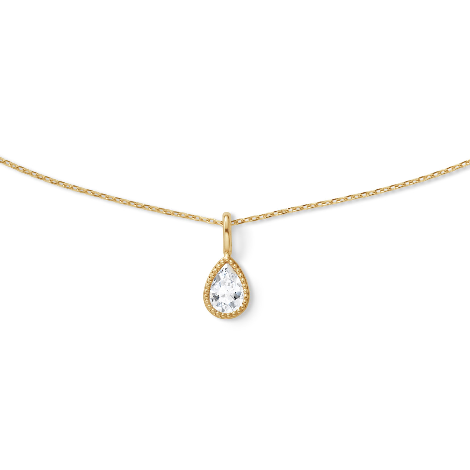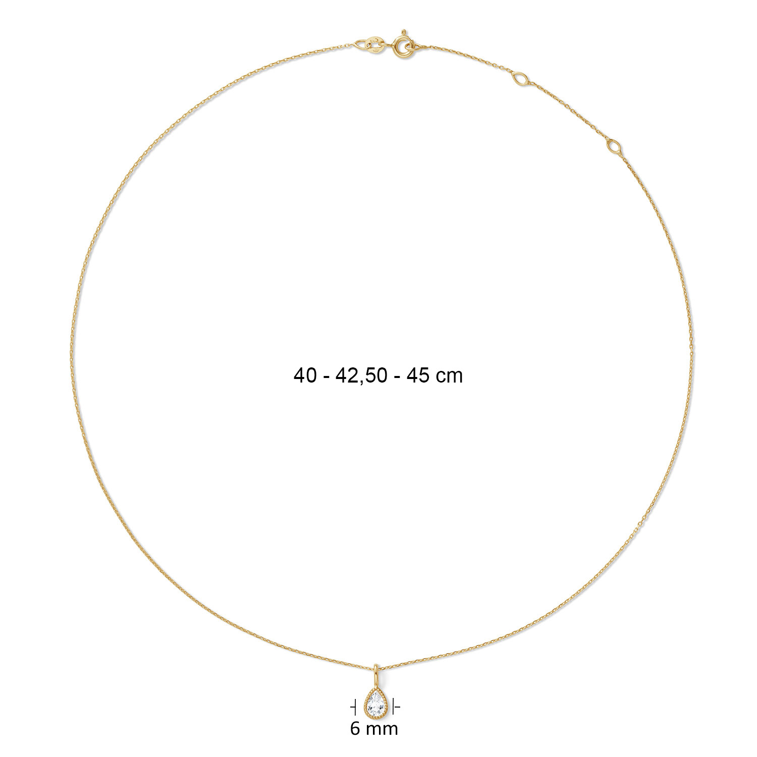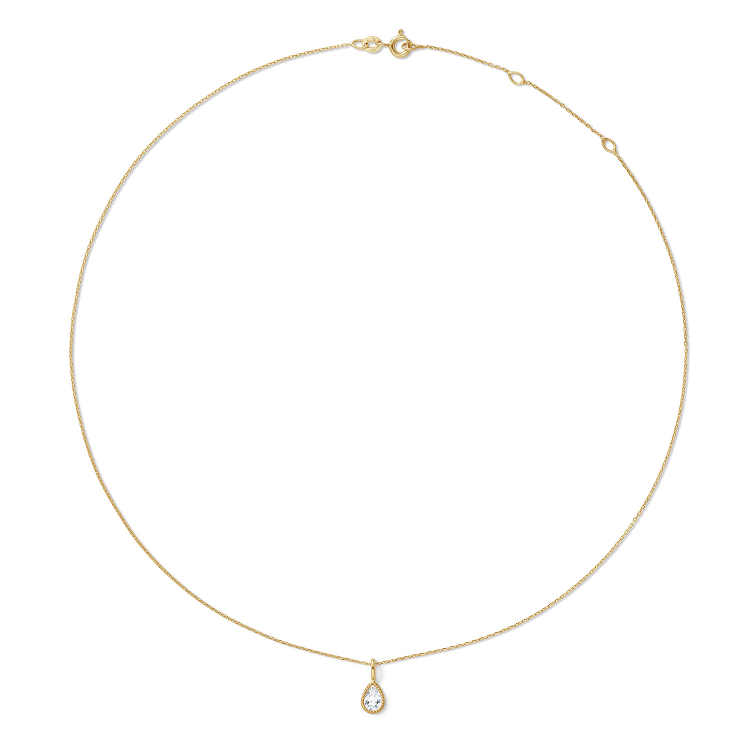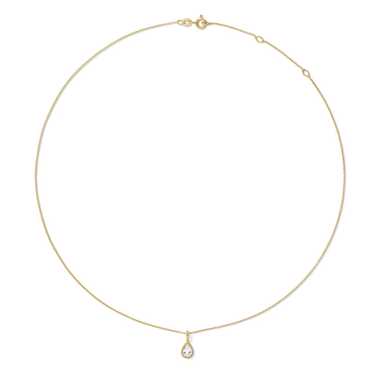This 14 karat gold necklace moves subtly with you—it's a swinging necklace. The white topaz sparkles in the sun. Please note: gemstones are natural products; colour or shape may vary. That’s what makes it unique!