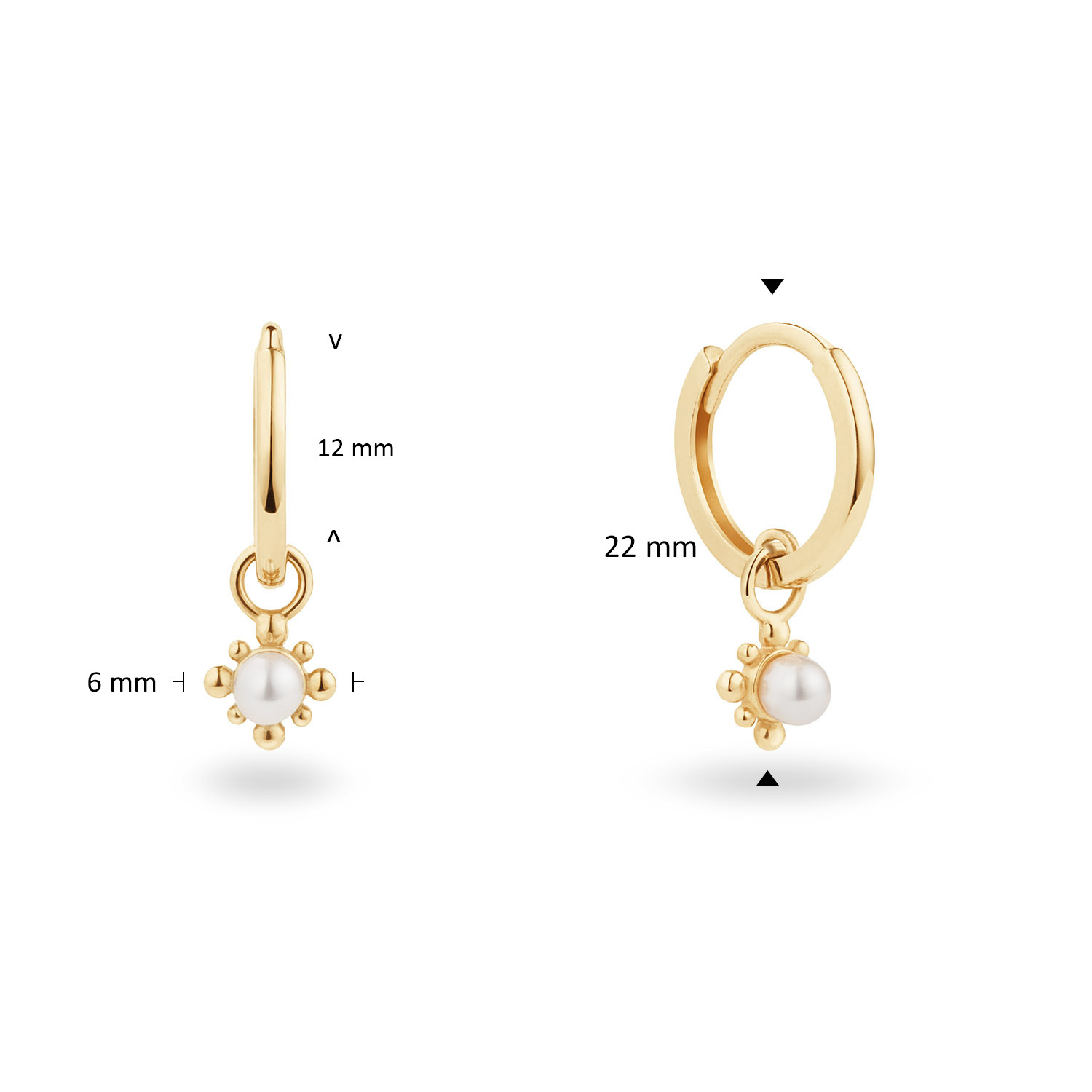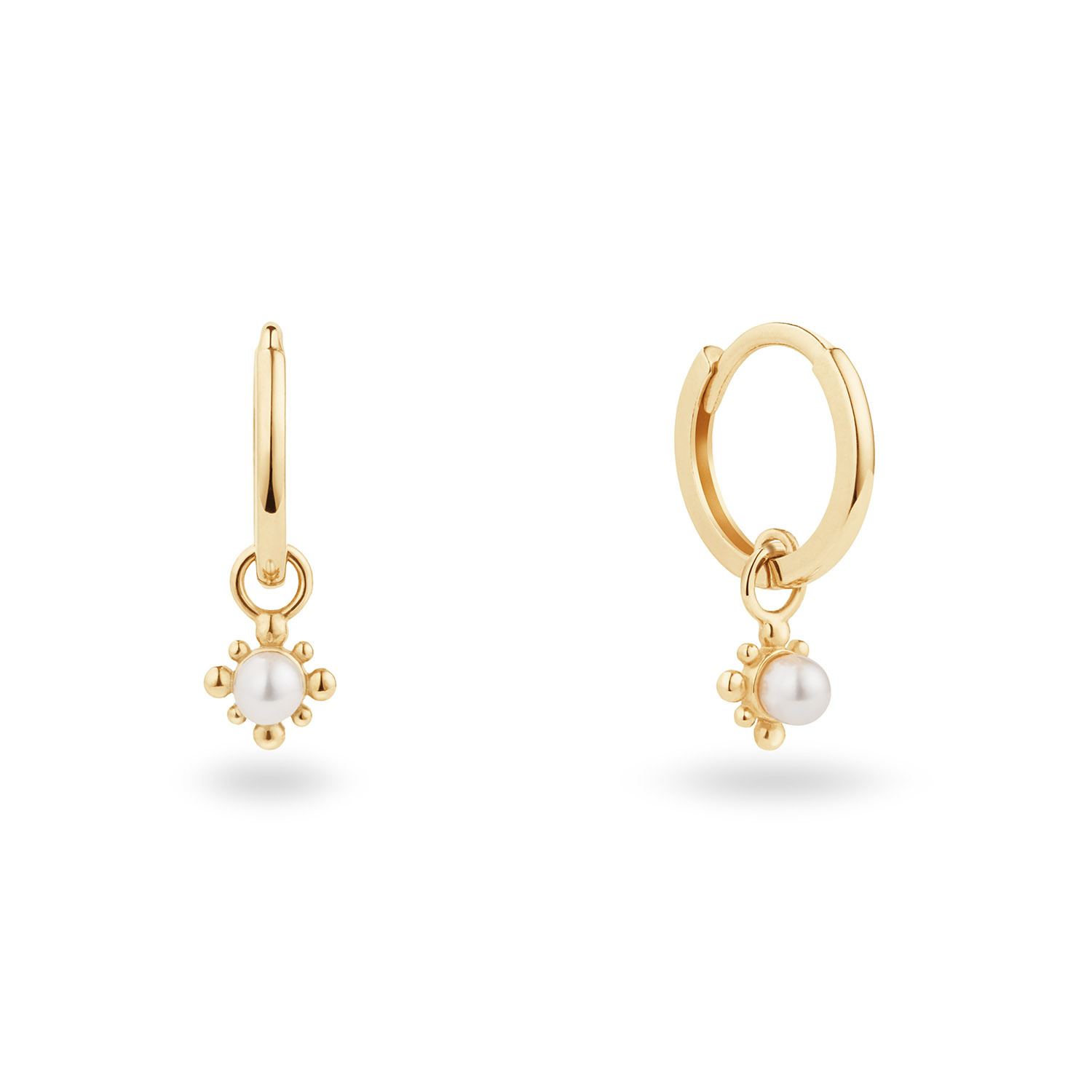These 14-karat gold earrings feature a subtle flower made of tiny beads with a small freshwater pearl in the center. It's as if you found it among the smooth stones of the famous beach.