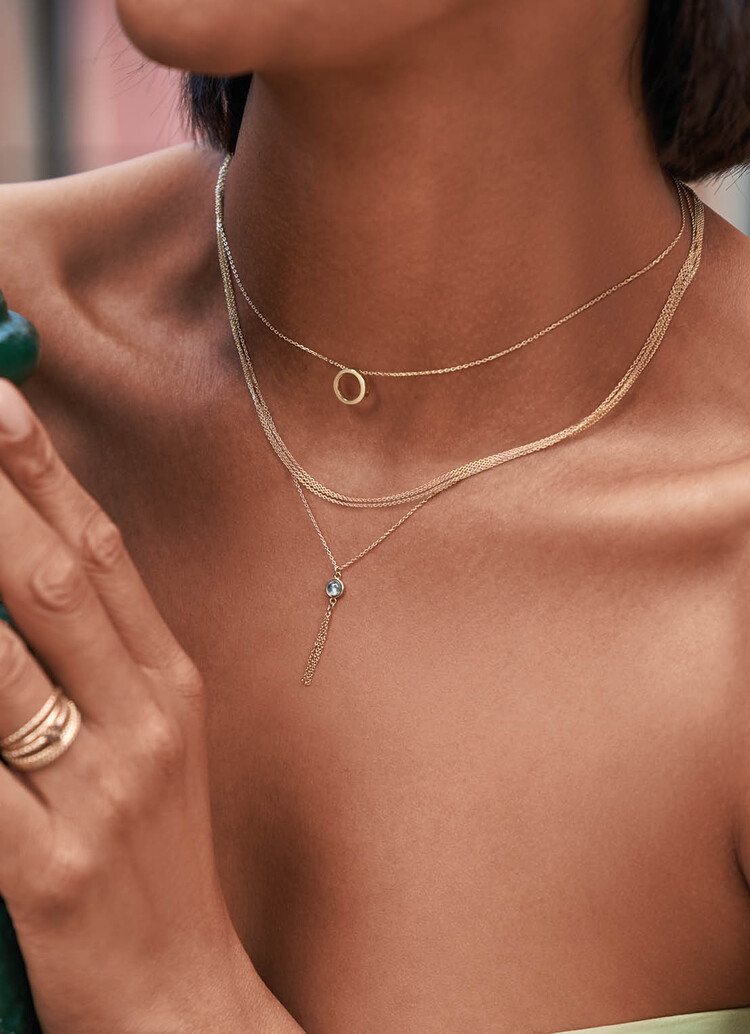• From one of the most beautiful secret gardens in Venice, I designed this 14 karat gold necklace. The light makes the mother-of-pearl constantly change color. Therefore, this necklace is a must-have for the perfect layer!