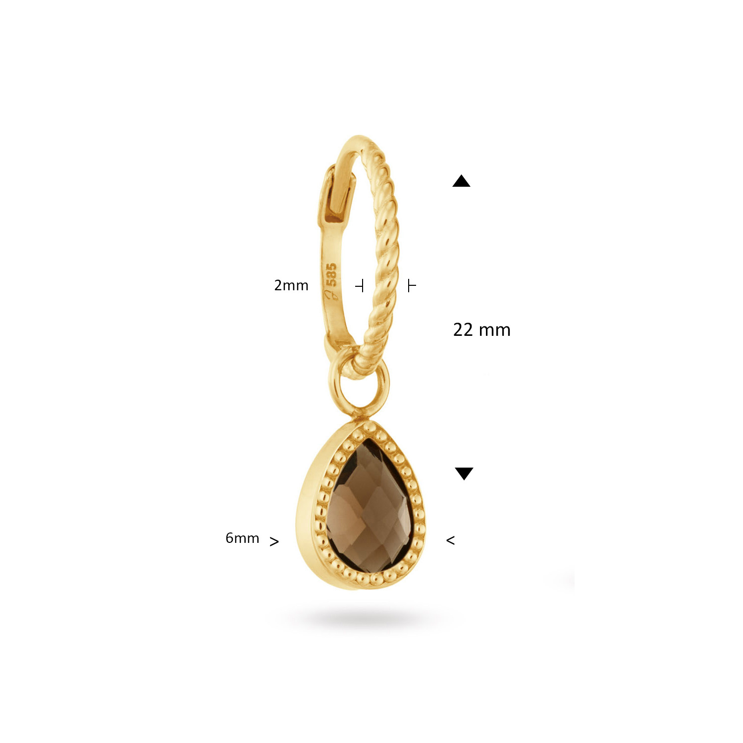 • Een klassieke hanger met een echte Rookkwarts edelsteen aan een 14 karaat gouden oorbel. Rookkwarts is een bruine tot zwarte variëteit van de kwarts en staat bekend om zijn aardende en beschermende eigenschappen.