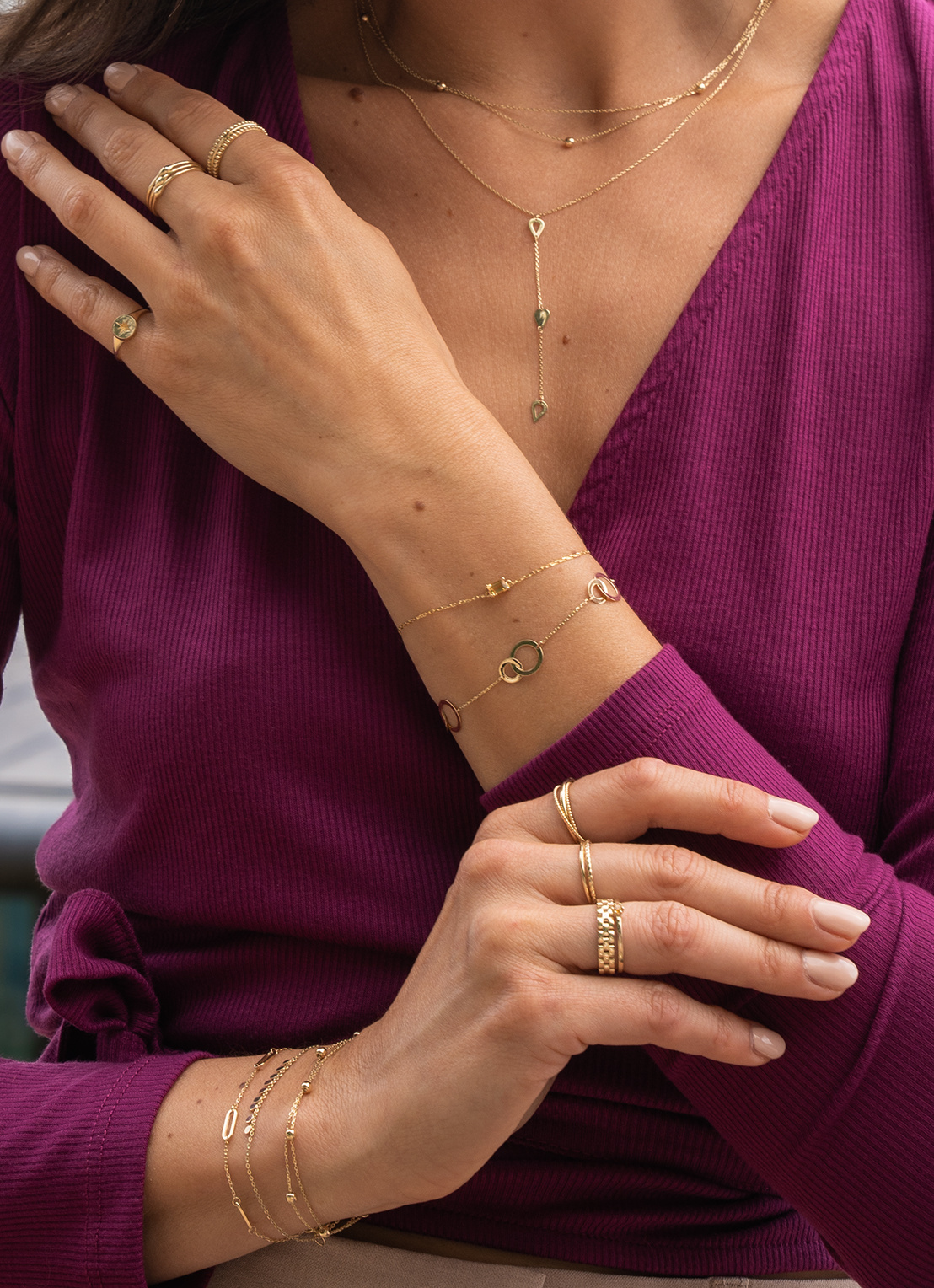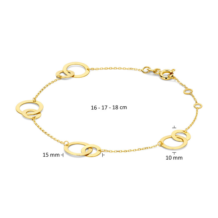 • Geinspireerd op de glitter and glamour van het nachtleven in Soho: de Soho Nights armband. Een fijne gouden armband met 4 opvallende tussenstukken van in elkaar gevlochten cirkels.